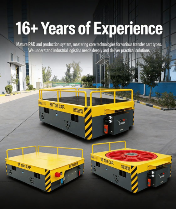 Certification of Strength: CE, ISO, SGS, SASO, and multiple national patents Manufacturing Facility: 30,000 m² with 3 dedicated production lines Global Reach: Products exported to over 50 countries Engineering-Driven Design: Custom transfer carts built for heavy-duty and complex environments Flexible Customization: Tailored solutions for unique load capacities, routes, and layouts Durable Performance: Designed for continuous operation under heavy loads and complex conditions Reliable Support: Long-term technical assistance and quality assurance